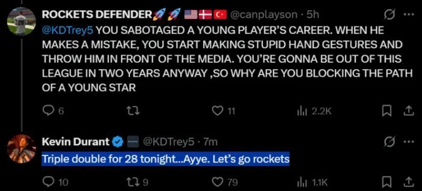 杜蘭特回覆:但申京這場拿到三雙(對陣雷霆),火箭,加油。