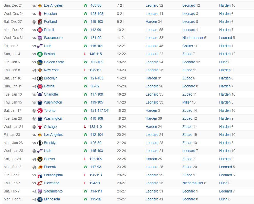 倫納德這場比賽34分鐘,30中14,三分11中5,罰球10中8,拿到41分8籃板2助攻4搶斷,命中率46.7%,三分命中率45.5%,真實命中率59.6%,正負值+20。