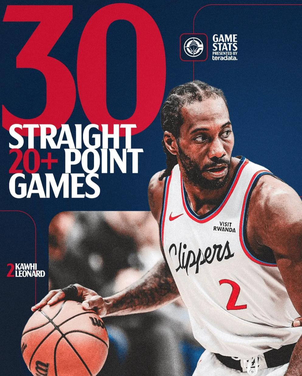 2.小卡連續30場20+在快船隊史超過格里芬;