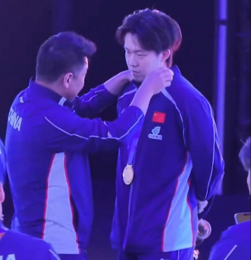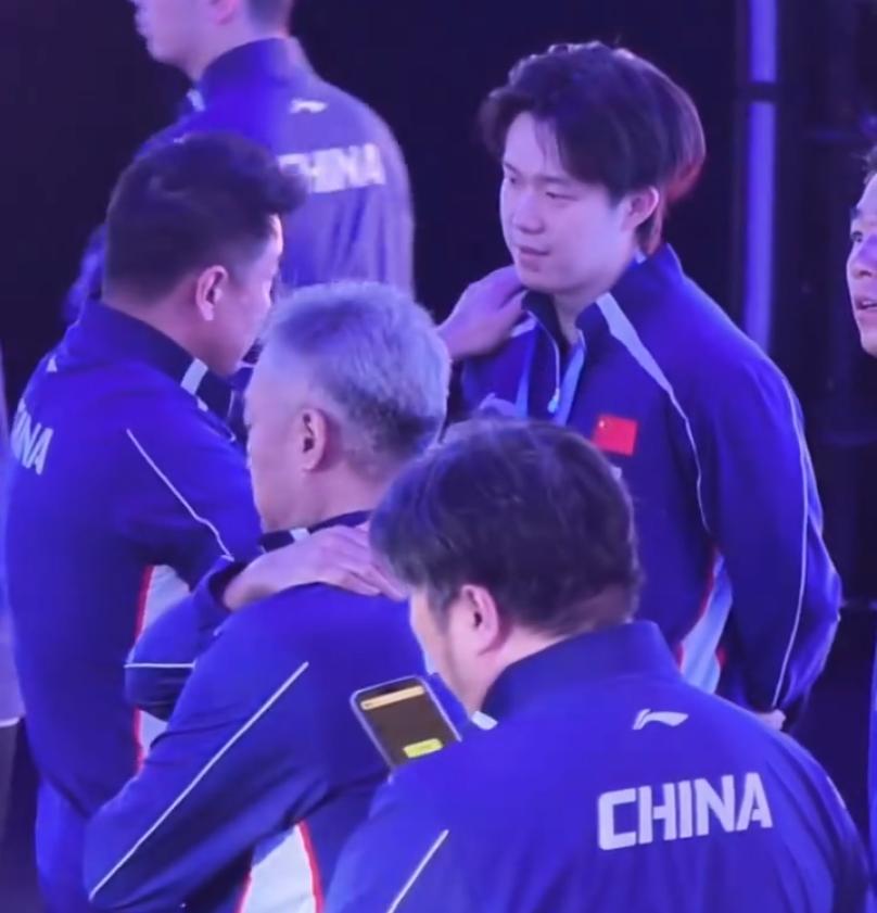 在男單的頒獎典禮後國乒全體人員要等着大合影,這時候王皓指導又過來跟王楚欽耳語,兩人的交談非常有愛,王皓一直都將手搭在王楚欽的肩膀上,王皓還爲王楚欽整理衣領,王楚欽拿到了亞洲盃男單冠軍的500積分可喜可賀。