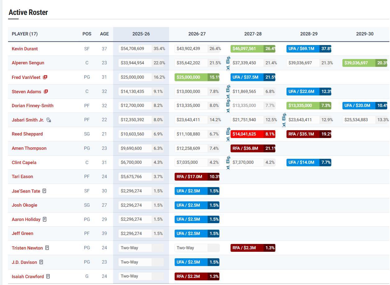 火箭隊目前大名單上是14+3,火箭隊距離第一硬帽只差125萬,這也是火箭競爭托馬斯失敗的一個要因,可拉塞爾的負面消息太多,除了火箭這種特別欠缺控球后衛的球隊纔會追求,火箭隊最多也只能給125萬的底薪。