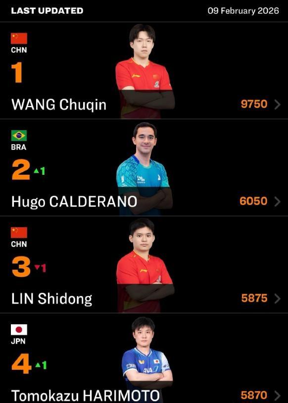 雨果-卡爾德拉諾剛剛在2026年美洲盃拿到冠軍,他的積分又增加500分,多哈球星挑戰賽他也進入四強210積分,多哈冠軍賽首輪遊15分,雨果憑藉這些積分來到6050分升至世界第二,他的世界排名也刷新了職業生涯新高。
