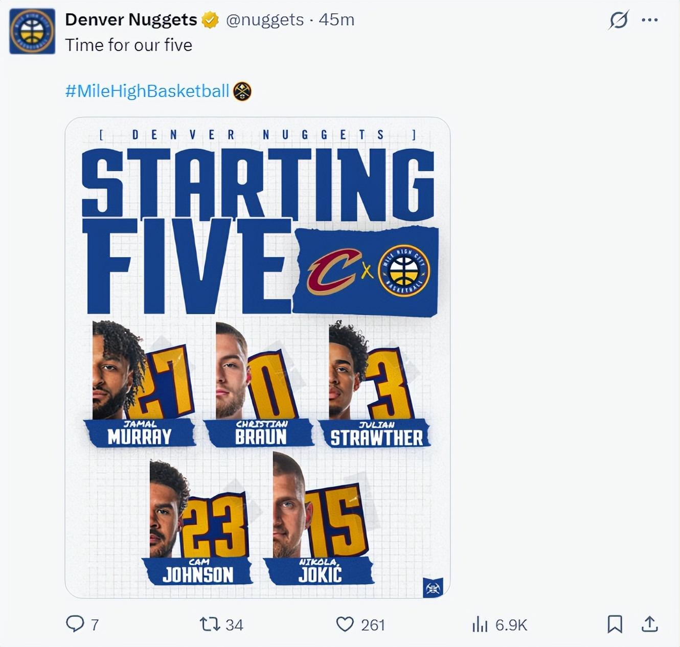 掘金:穆雷、布勞恩、斯特勞瑟、約翰遜、約基奇;