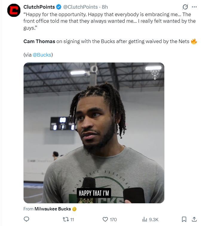托馬斯在簽約雄鹿後接受採訪,他說道:很高興能有這個機會加盟雄鹿,也很高興大家接納了我,球隊管理層告訴我,他們一直都希望我能加入,我能感受到隊友們的認可。