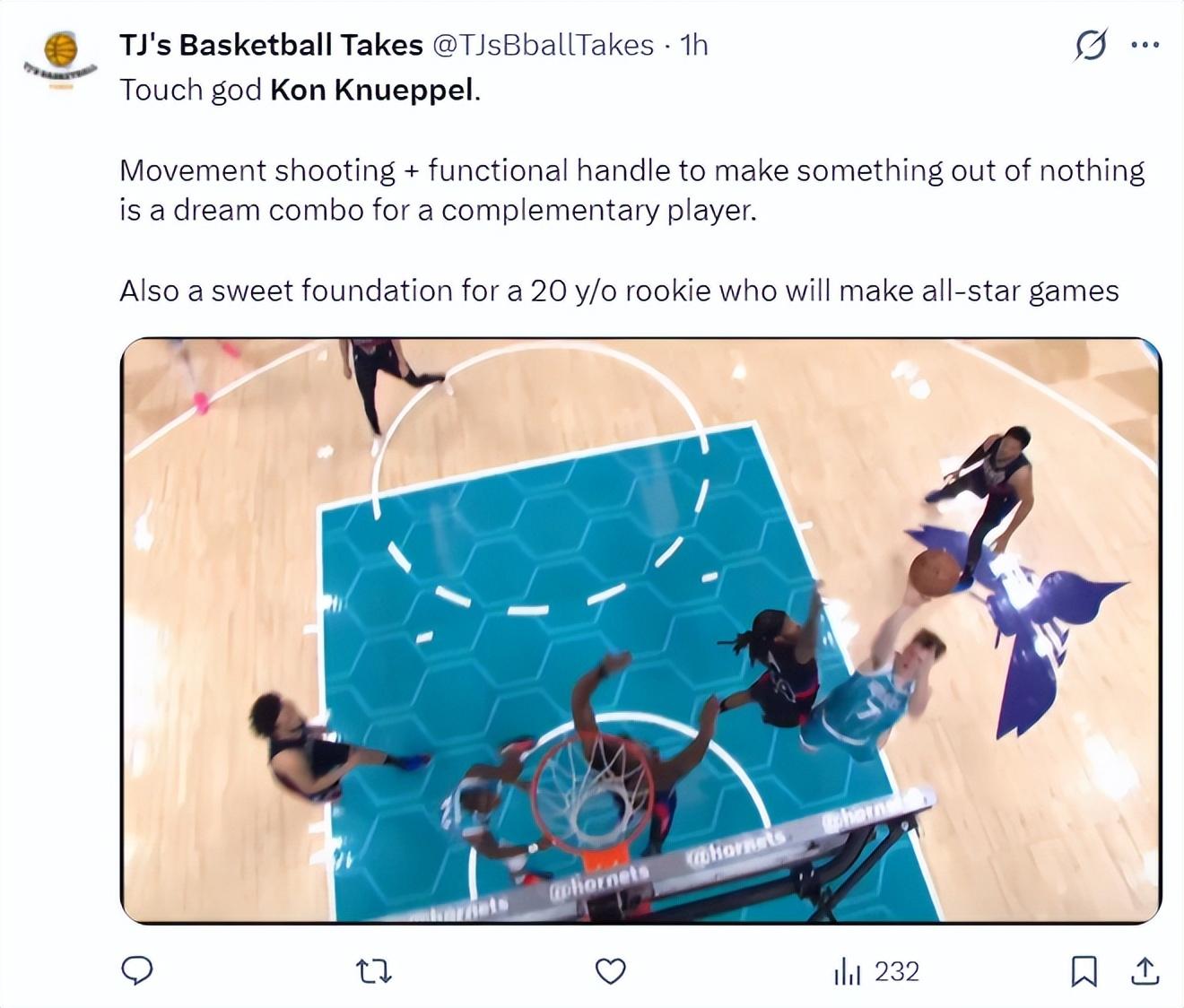 上半場克努佩爾有一個持球突破拋投高打板的球,美媒寫道:天啊,克努佩爾在移動中的拋投都如此出色,他能在毫無空間的情況下製造出手機會,他這樣的球員可以兼容任何一個體系。對於一個20歲的新秀來說這無疑是極好的起點。