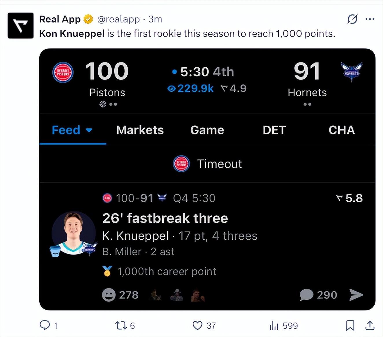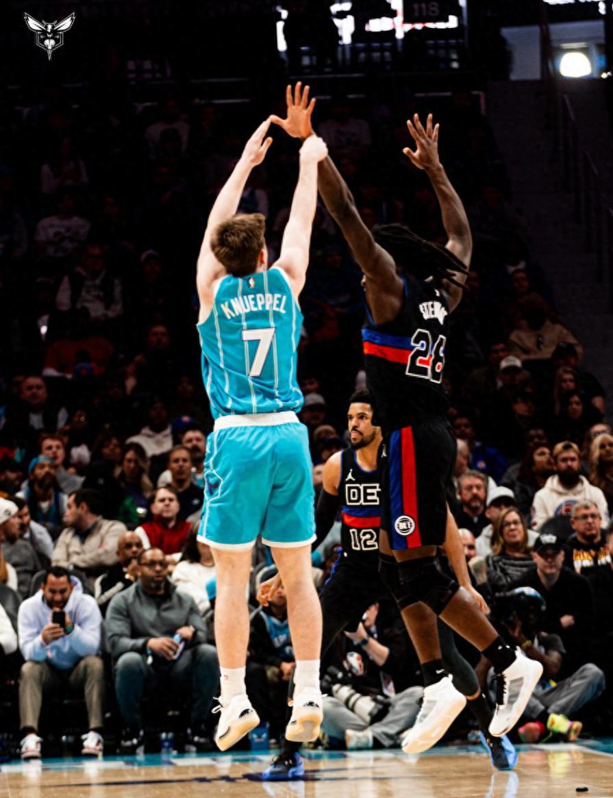 在末節還剩5分30秒,克努佩爾命中第五個三分球,他也憑藉這第五個三分球達成了新秀1000分里程碑。