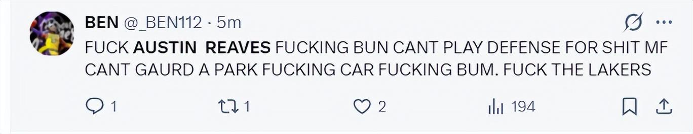 賽後湖人球迷也炮轟裏夫斯:去XX的裏夫斯,他根本不會防守,他在場上任何一個人他都防不住,FuX混蛋,去XX的湖人隊。