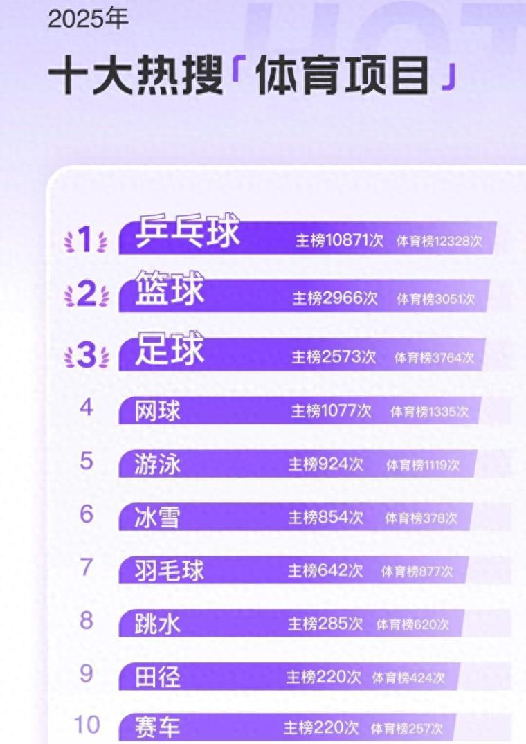根據WTT官方的消息,2025年度10大熱搜體育項目,乒乓球主榜10871次,體育榜12328次穩居第一,這比排在第二的籃球高出接近五倍之多,之後分別是足球、網球、游泳、冰雪、羽毛球、跳水、田徑、賽車。