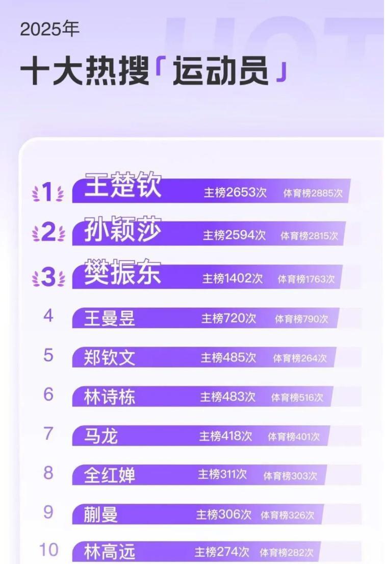 而年度10大熱搜運動員有8人是乒乓球運動員,只有鄭欽文、全紅嬋兩人不是乒乓球運動員,王楚欽、孫穎莎、樊振東、王曼昱、鄭欽文、林詩棟、馬龍、全紅嬋、蒯曼、林高遠。兩位單打世界第一分別在第一與第二。