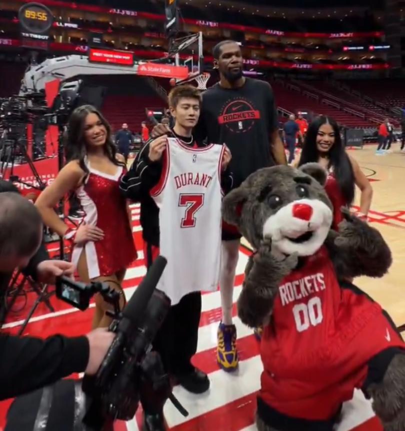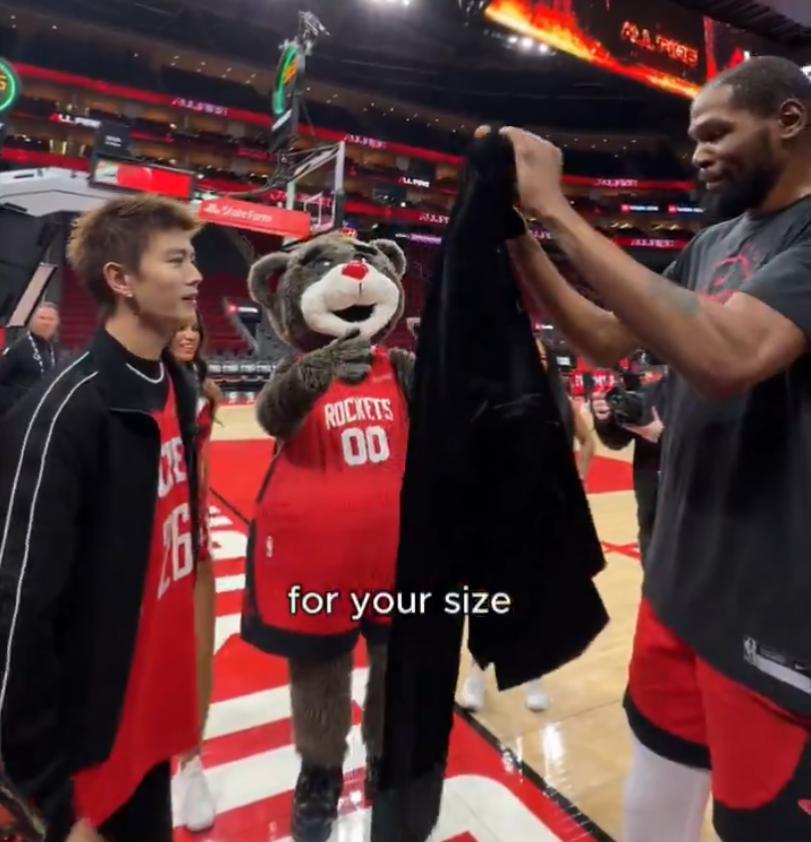 這場比賽之前中國娛樂明星任嘉倫來到火箭主場與凱文-杜蘭特進行了互動,他爲杜蘭特送上了唐裝,杜蘭特也將自己火箭7號球衣送給他,任嘉倫還表示這是按照杜蘭特2.11米的尺寸定做的,杜蘭特表達了感謝,杜小帥還說希望跟任嘉倫一樣帥。