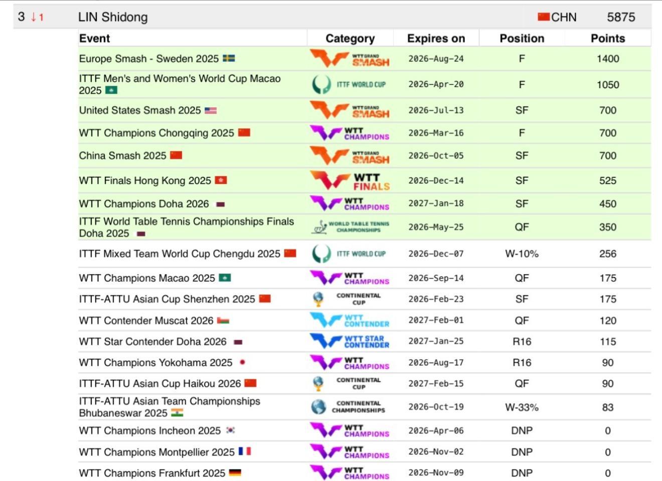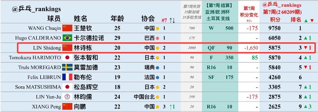 最新一期的世界排名已經出爐,因爲這一期2025年WTT新加坡大滿貫的積分失效,林詩棟是去年新加坡大滿貫的男單冠軍,最終林詩棟-1650分來到5875分世界排名下滑到第三,雨果6050升至世界第二。