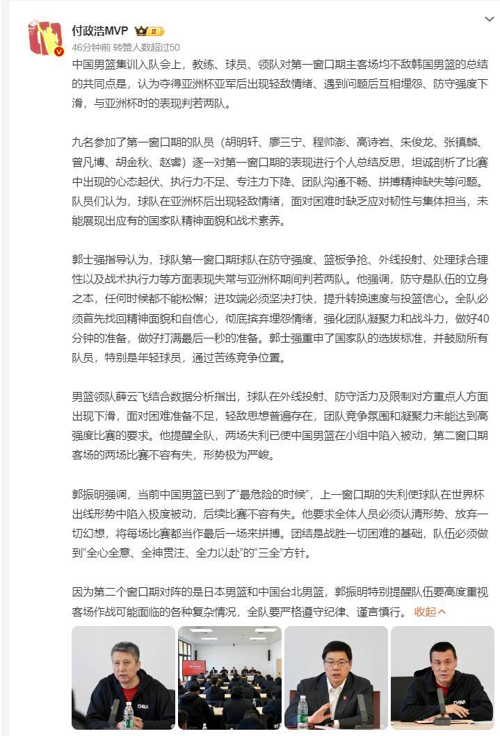 中國男籃的集訓入隊會上,郭振明表示‘中男籃已經到了最危險的時候’,上一個窗口期的二連敗讓球隊在世界盃出線形勢極度被動,後續的比賽不容有失,需要全體人員認清形勢放棄一些幻想,把每一場比賽當最後一場去拼。