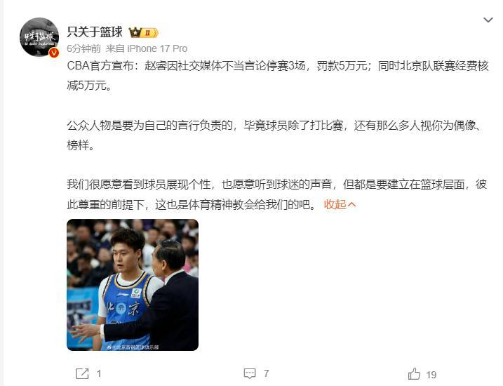 北京時間2月11日晚,CBA公司官方宣佈對北京男籃球員趙睿進行處罰,趙睿因爲在社交媒體發佈嚴重不當言論被處以停賽三場、罰款5萬元。