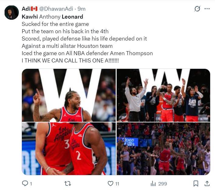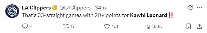 快船官方曬出了決勝一投的海報,末節倫納德10中6狂砍19分5籃板2助攻2搶斷,全場比賽33分鐘,20中9,三分5中1,罰球8中8,拿到27分12籃板4助攻4搶斷4失誤, 命中率45%,三分命中率20%,