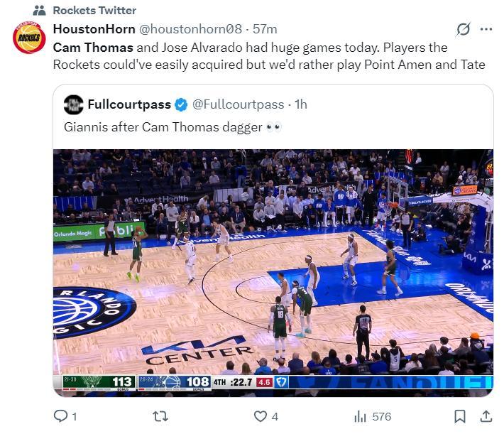 休媒賽後轉發了托馬斯超遠三分的瞬間寫道:原本我們有機會簽下托馬斯這樣的得分手,但烏度卡更願意使用阿門、泰特這樣的防守者都不願意簽得分手。