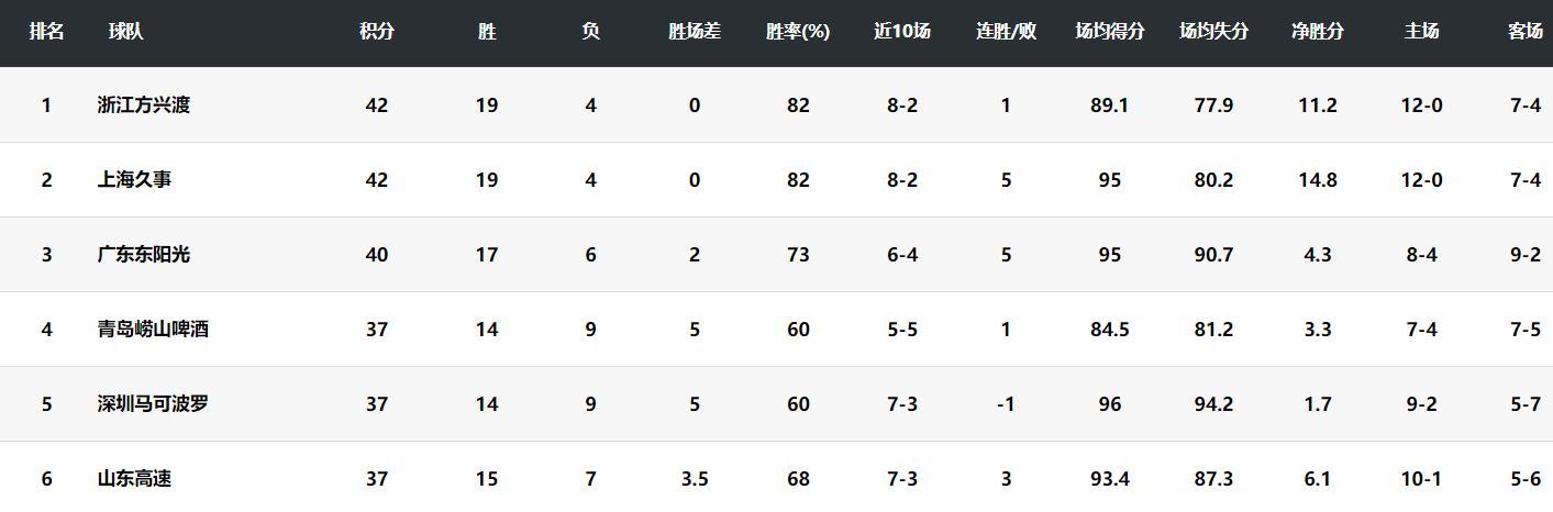 拋開俱樂部杯不算,上海男籃本賽季戰績19勝4負跟衛冕冠軍廣廈一樣,上海男籃排在積分榜的第二位。