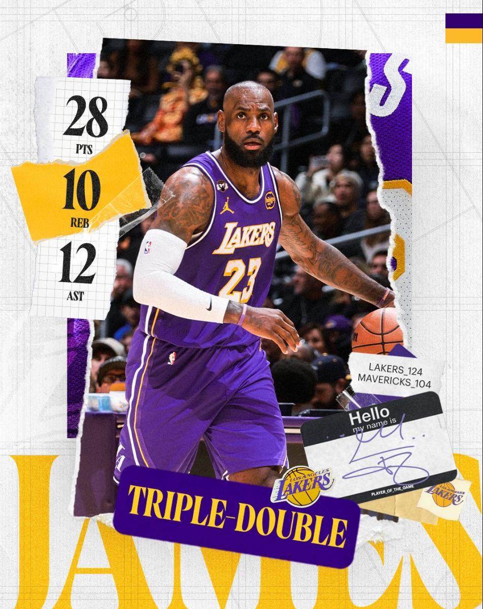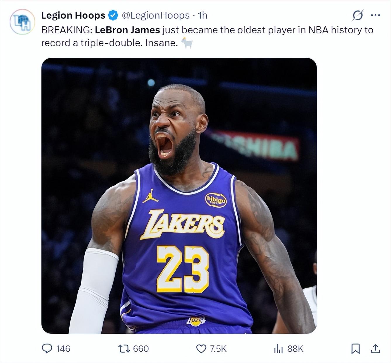 美媒LH寫道勒布朗成爲歷史最年長的三雙球員,GOAT。