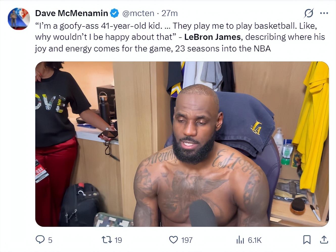 賽後詹姆斯接受採訪:我就是一個41歲的老咕嚕棒子,我就是登場打球,他們願意付錢讓我打球,我有什麼理由不高興呢?(這句話大概率已經說明詹姆斯對湖人管理層失望了)