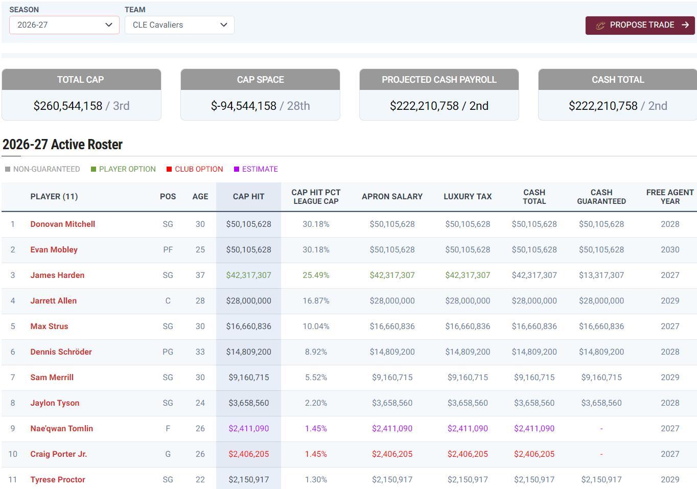 換言之外界都覺得勒布朗-詹姆斯將要重返克利夫蘭,但騎士隊今夏要簽下勒布朗-詹姆斯難度很大,26-27賽季騎士隊11份保障名單總支出就高達2.605億美元,騎士已經是超奢侈稅第二徵點的球隊,所以詹姆斯成爲自由球員後騎士只能給詹姆斯老將底薪370萬。