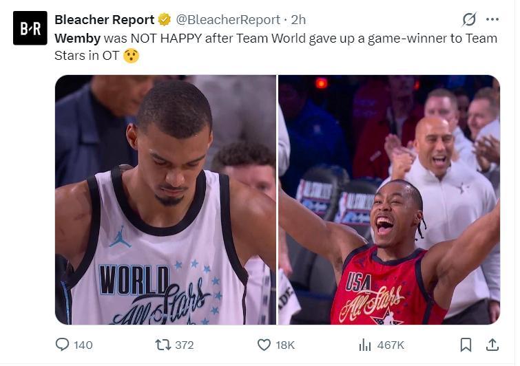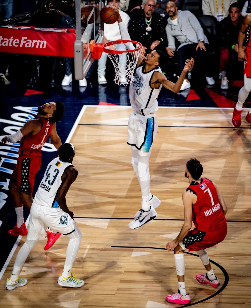 在世界隊VS美國星隊的G1中,兩隊鏖戰至加時賽,但在加時賽最後時刻斯科蒂-巴恩斯完成了一個三分絕殺,文班亞馬隨即低頭沮喪,這場全明星正賽堪稱21世紀最激烈、最精彩的全明星,因爲文班亞馬開場就積極性十足,只可惜他的隊友們根本沒有用心。
