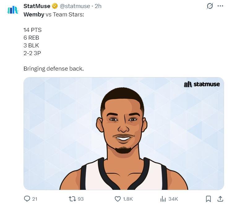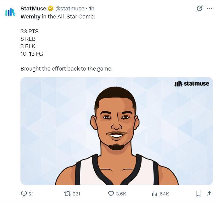 美媒賽後用一句話來概括:能在未來多年看到文班亞馬活躍在全明星的舞臺是一件令人高興的事。