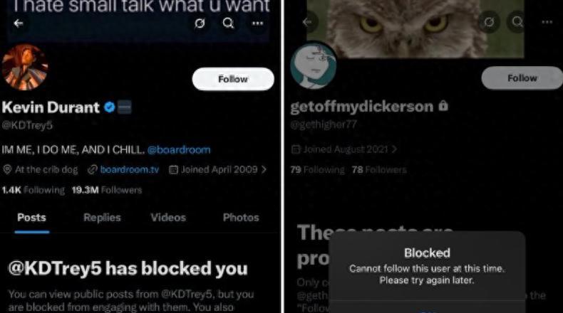 北京時間2月16日,有一位網友在社媒上爆料有一個名爲‘getoffmydickerson’的賬號疑似是凱文-杜蘭特的小號,因爲杜蘭特的大號與這個getoffmydickerson賬號都將他拉黑了,他就覺得這個getoffmydickerson是杜蘭特小號,而這個getoffmydickerson多次語出驚人。