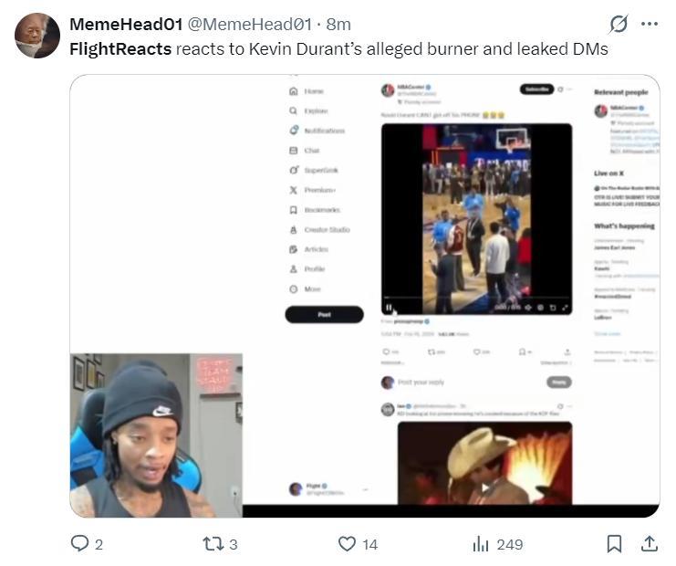 除了杜蘭特疑似小號的事件,北京時間2月16日,美國網紅FlightReacts還在個人社媒上吐槽杜蘭特,他表示杜蘭特在全明星賽前還在玩手機,他寫道:KD啊,別再刷社媒了,別再用你的小號了,不要在社媒上跟別人對線了,好好打籃球吧!停止用社媒吧,專心打完這個賽季再說。