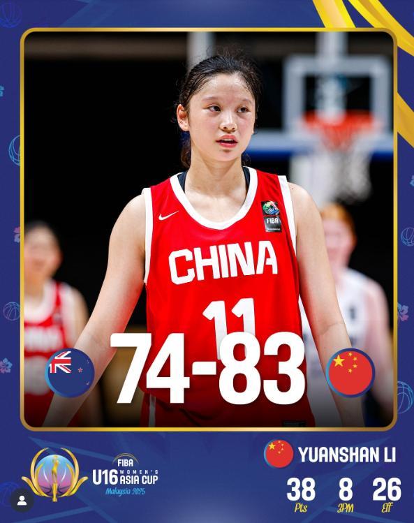 去年U16女籃亞洲盃的第一場比賽,李沅珊就打出單場38分創造國少紀錄,她在面對新西蘭的比賽中獨扛一隊,全場比賽36分鐘,29中14,三分16中8,拿到38分3籃板0助攻2搶斷僅1失誤,命中率48.3%,三分命中率50%,得分佔比超過全隊45%。