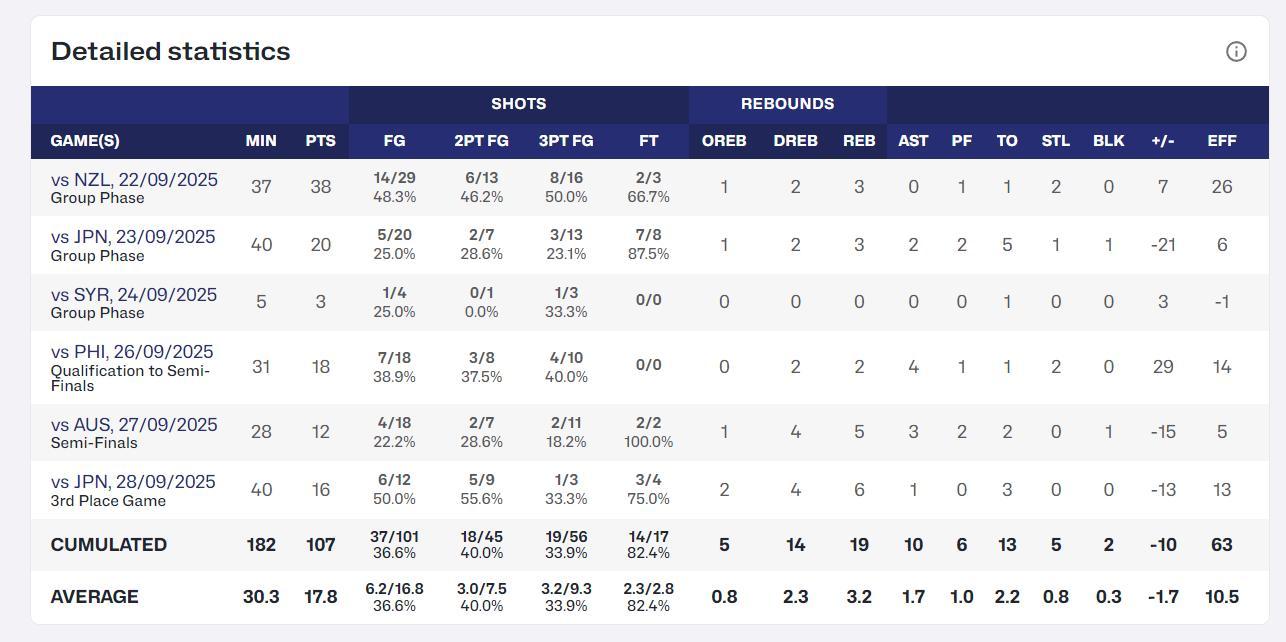 在去年的亞洲盃中,李沅珊場均30.3分鐘,拿到17.8分3.2籃板1.7助攻0.8搶斷0.3蓋帽,命中率36.6%,三分命中率33.9%。在這支沒有純一號位的U16女籃中她還要客串一號位,李沅珊運球過半場都被雙人包夾。
