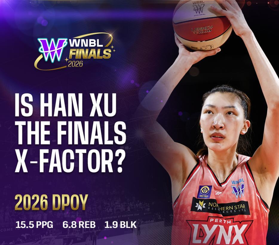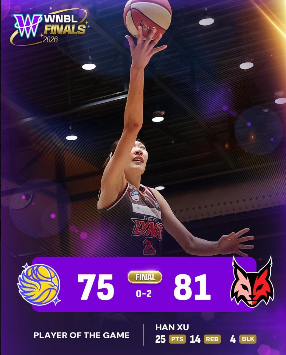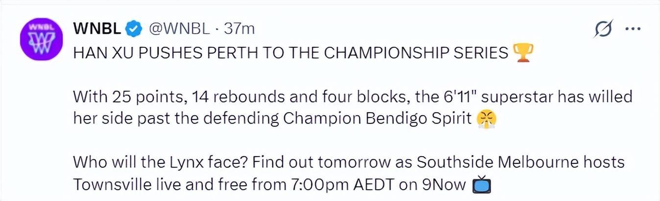 WNBL官方寫道:韓旭幫助珀斯山貓奪得半決賽的勝利。這位身高6尺11寸的超級巨星貢獻了25分14籃板4蓋帽帶領她的球隊橫掃衛冕冠軍本迪戈精靈隊。