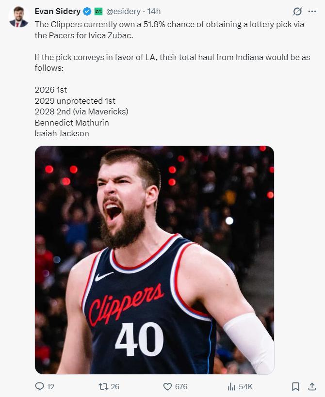 根據《福布斯體育》記者埃文-斯迪瑞的報道,步行者這個2026年首輪簽有51.8%的概率是樂透籤,換言之步行者爲了得到祖巴茨犧牲了1個樂透籤、2029年不保護首輪(是否樂透還未知)但這足以扎心洛杉磯湖人隊。