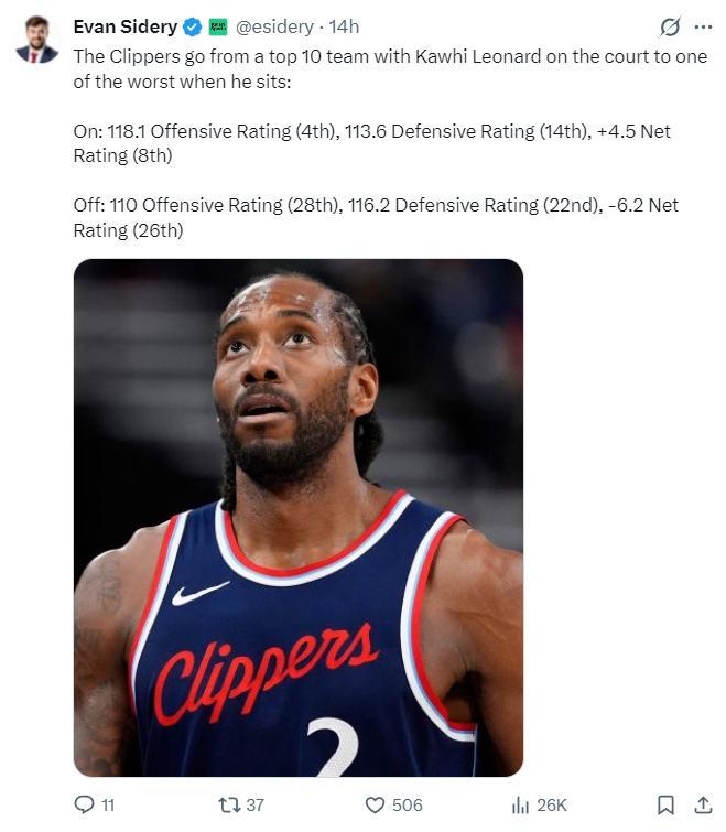 根據《福布斯體育》記者埃文-斯迪瑞最新的消息,本賽季的倫納德算是獨扛快船,卡哇伊在場時快船進攻效率118.1(聯盟第四),不在場時進攻效率110(聯盟28)。