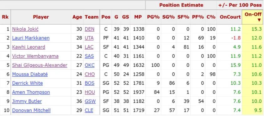 除此之外根據BXR的數據,倫納德在本賽季的ON-Off(在場與離場百回合正負值的差值)11.6排在聯盟第三。