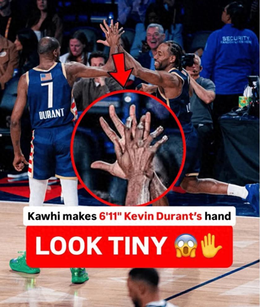 科懷-倫納德在全明星正賽是大放異彩,尤其是他與凱文-杜蘭特擊掌的一個瞬間,他的手掌足足比杜蘭特大了一圈,根據NBA官方的數據,倫納德手掌寬度28.5cm-29cm,手掌長度是24.75cm-24.8cm,杜蘭特一直以來都是聯盟知名的小手掌。