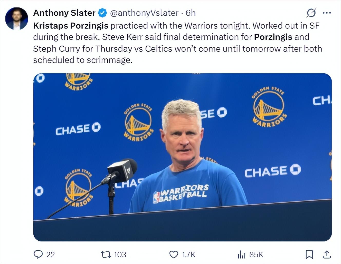 北京時間2月18日,科爾在採訪中透露波爾津吉斯的近況,他說道:在整個全明星週末期間,珀金都在舊金山訓練,他是否出戰對陣凱爾特人的比賽還要看明日的情況,波爾津吉斯已經完成過3V3、5V5的對抗訓練。庫裏也將歸隊,屆時這兩人都會參與球隊的對抗賽。