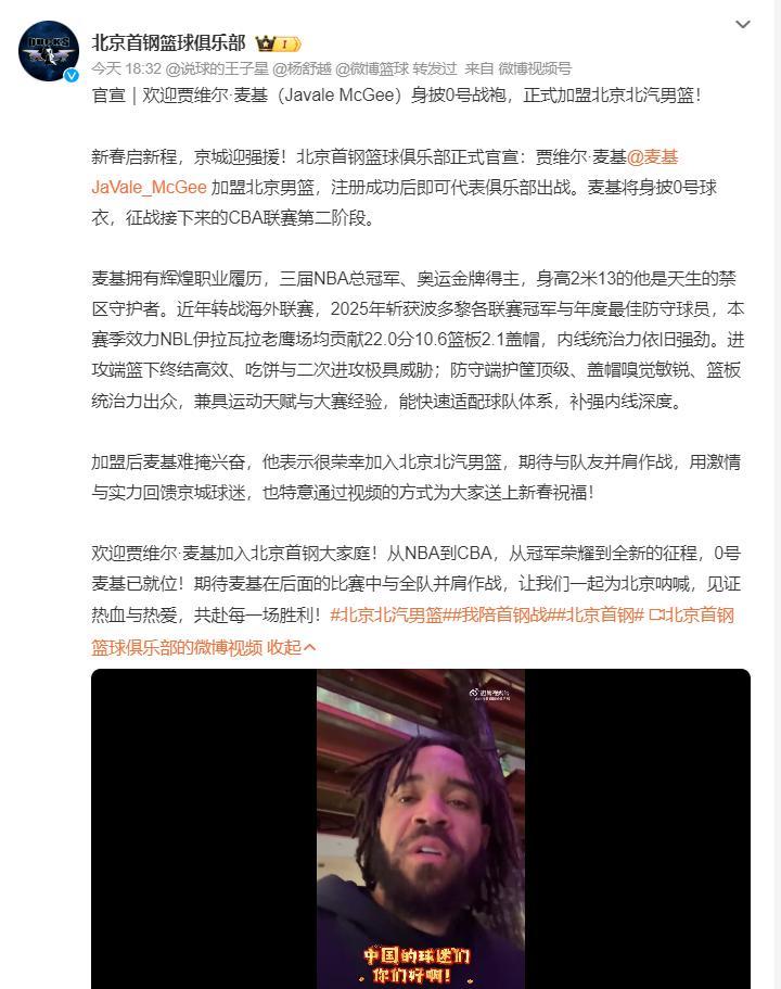 北京時間2月18日,北京首鋼男籃剛剛官宣麥基將身披0號球員爲北京男籃出戰,他將代表北京隊出戰CBA第二階段。從NBA到CBA,從三屆NBA總冠軍、奧運金牌到CBA全新的征程,麥基將與北京全隊一同並肩作戰。