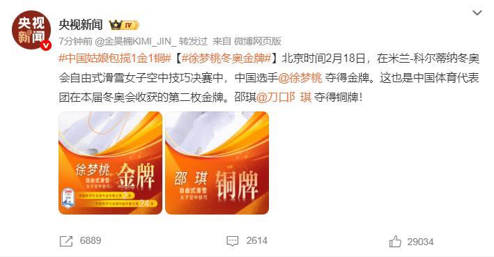 央視新聞立馬發來賀電:中國選手徐夢桃奪得金牌,這是本屆冬奧會的第二枚金牌,邵琪奪得銅牌。