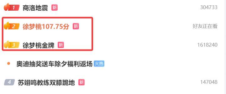徐夢桃金牌登上了國內熱搜榜,第一跳孔凡鈺113.33第二,徐夢桃107.75第三,邵琪105.93第四晉級決賽次輪。