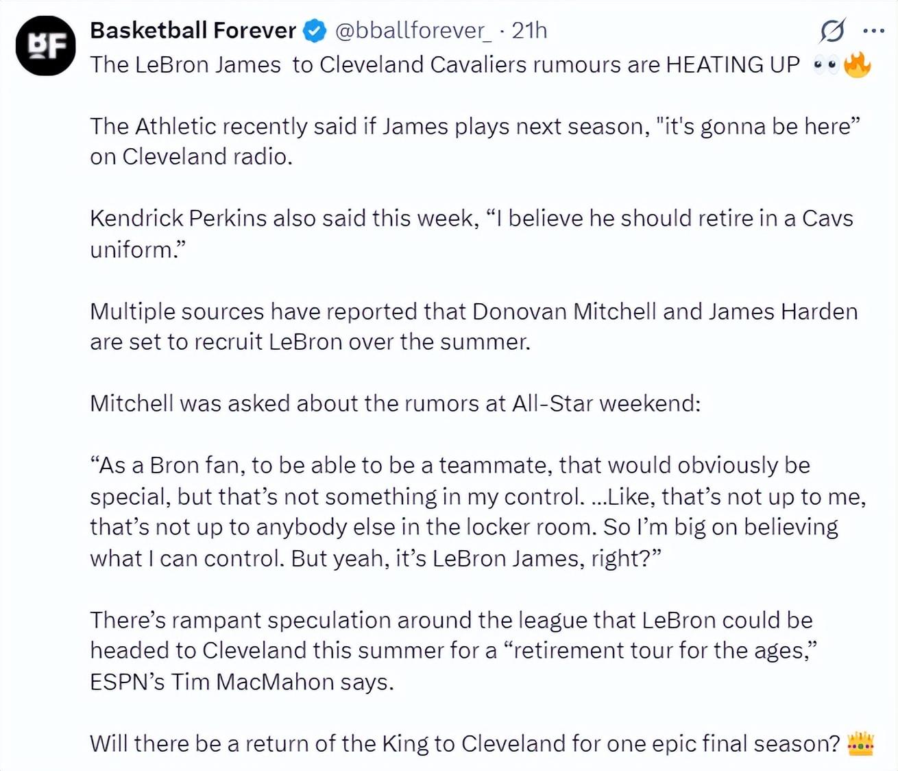 美媒TA也認爲下賽季詹姆斯一定會重返克利夫蘭,米切爾、哈登也會在今夏招募詹姆斯,美記蒂姆-麥克馬洪透露詹姆斯今夏可能重返克利夫蘭開啓一場‘史無前例的退役巡演’。