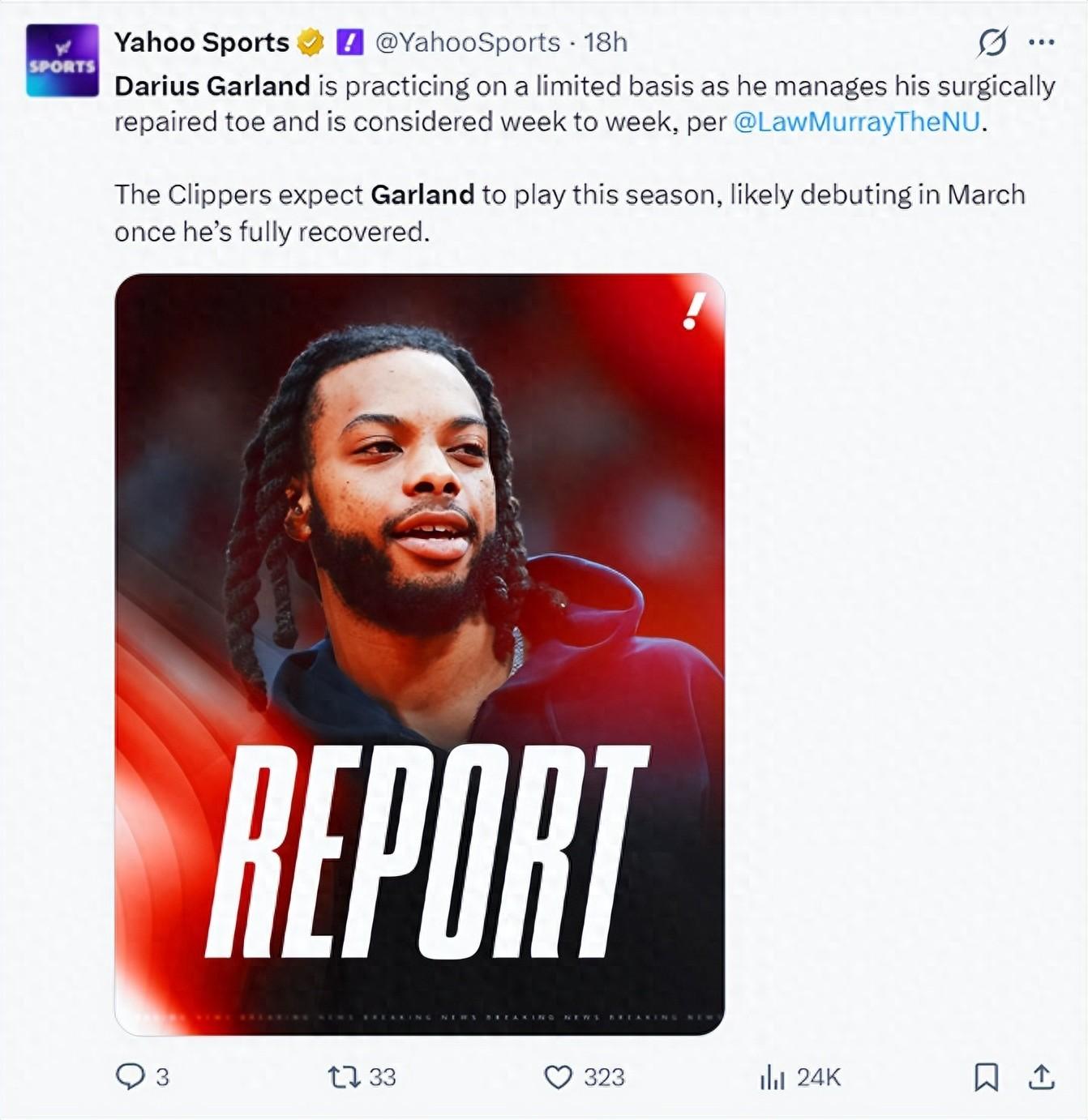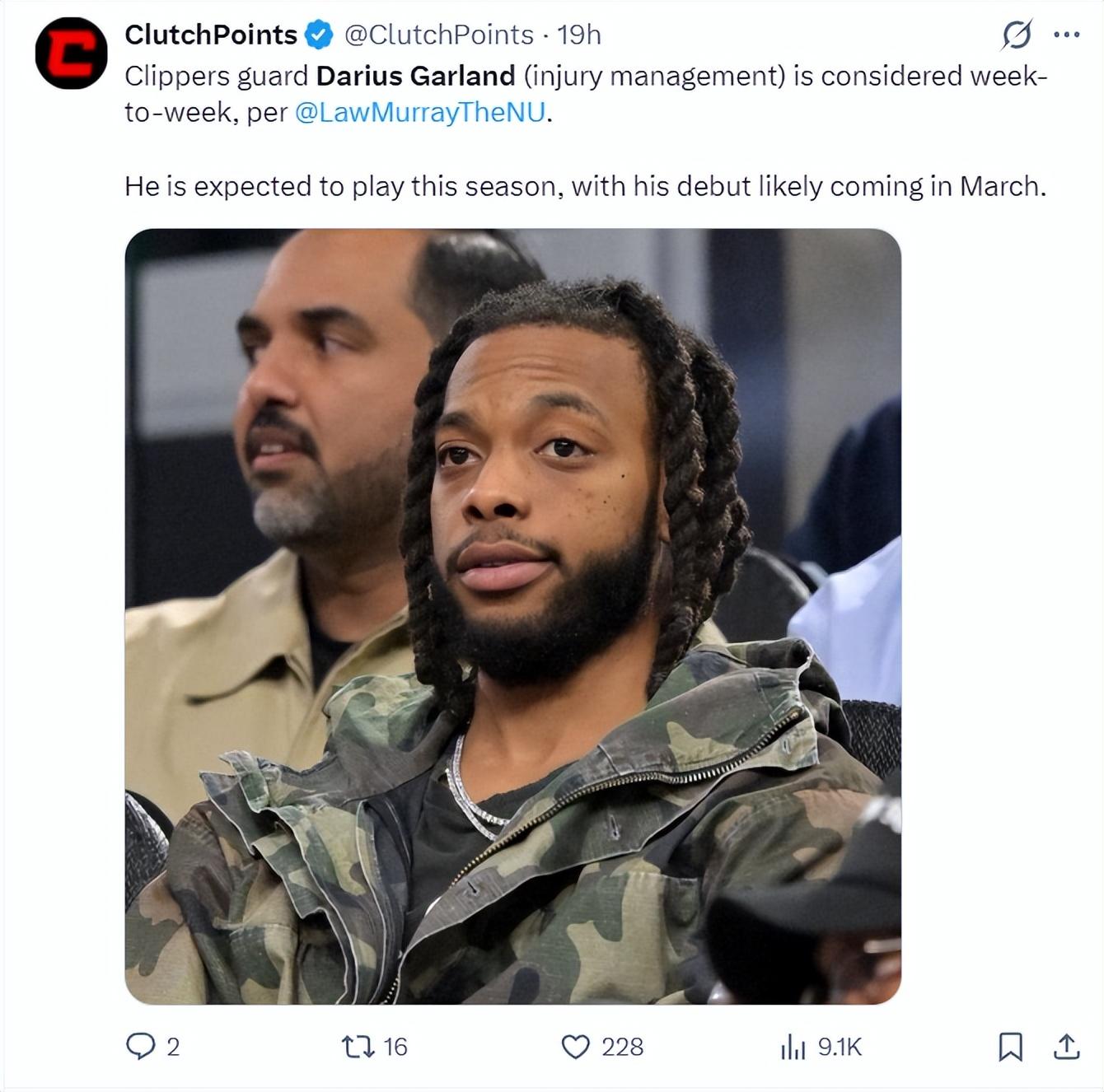 勞裏-穆雷還透露快船每一週都要對加蘭的傷勢進行新的評估,預計他首次身披快船球衣登場會在三月份。