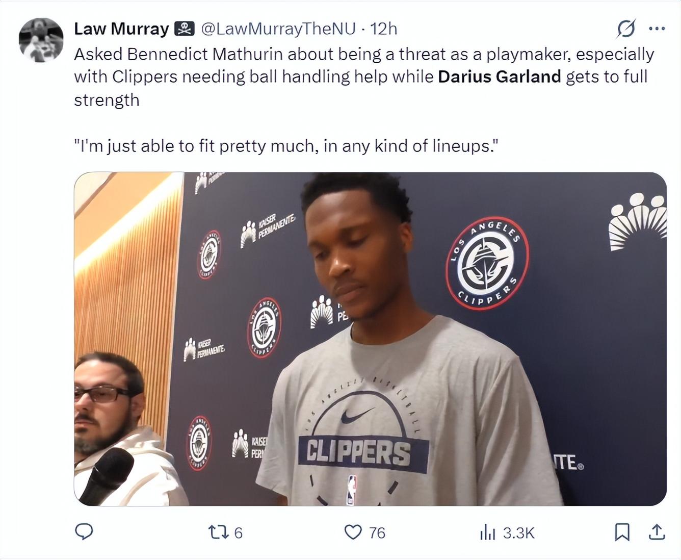 快船新援馬瑟林談到加蘭還無法登場,他表示:我基本上可以在任何陣容中找到自己的位置,球隊需要我做組織核心時我就會去做,尤其是在加蘭缺席快船需要加強控球能力的情況下。