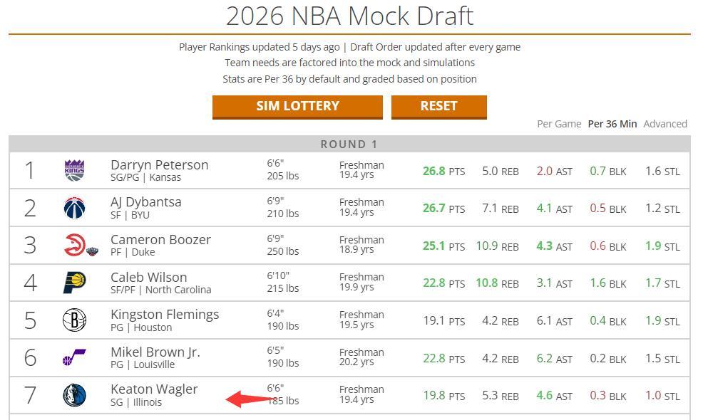 根據選秀網站的預測,獨行俠將抽中首輪七號籤,他們將選中來自伊利諾伊大學的得分後衛基頓-瓦格勒,他是一位身高1.98米的得分後衛,也就是一位足尺寸的二號位,下賽季獨行俠的陣容天賦將更爲爆炸。