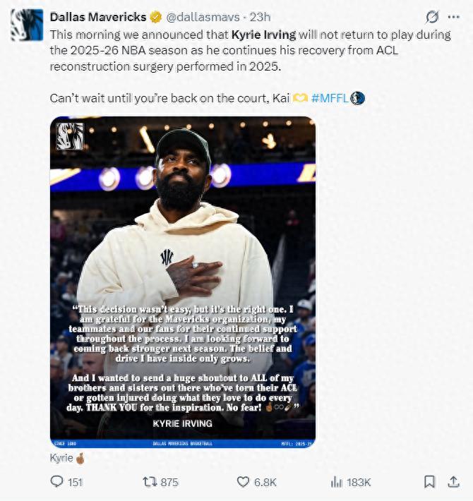 北京時間2月19日,獨行俠官方宣佈歐文繼續康復左膝ACL撕裂手術傷,本賽季不會復出,他的復出將推遲到下賽季。這一切都是爲了得到歐文100%康復再回歸賽季,併爲他在26-27賽季衝擊總冠軍創造機會。