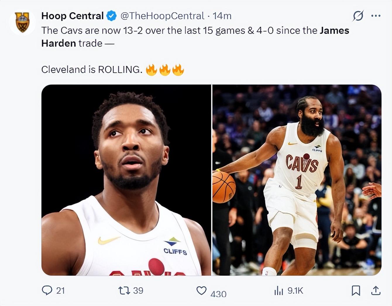 騎士隊最近的15場比賽贏下了其中的13場,哈登到來後又是一波4連勝,克利夫蘭騎士隊真的一躍成爲奪冠熱門之一,如果今夏還能以底薪簽下勒布朗-詹姆斯,下賽季的騎士或許將成爲聯盟最強球隊。