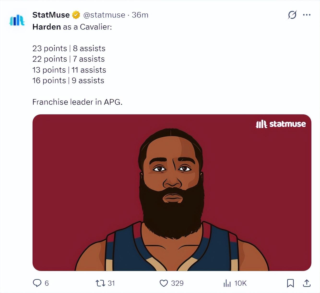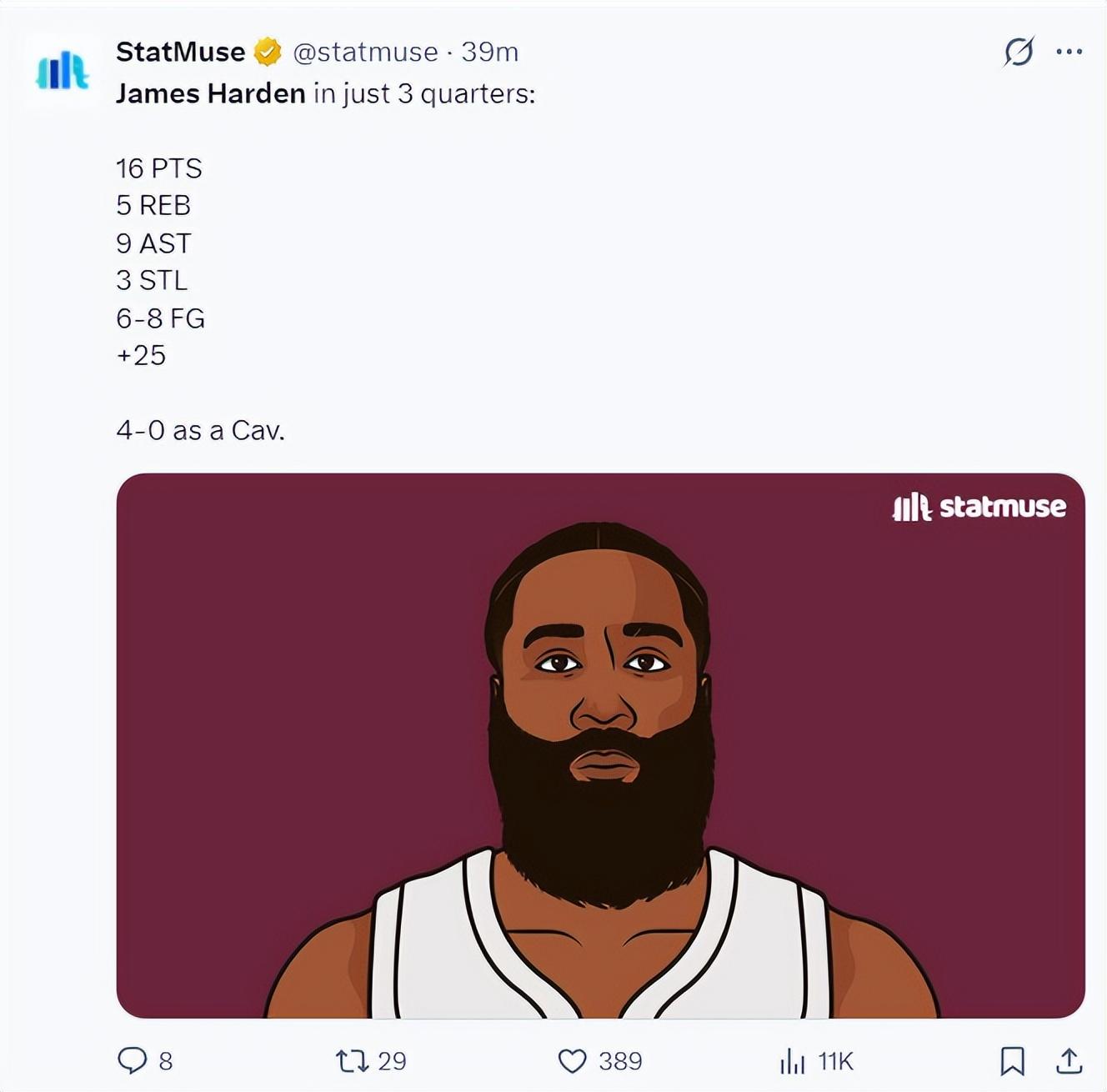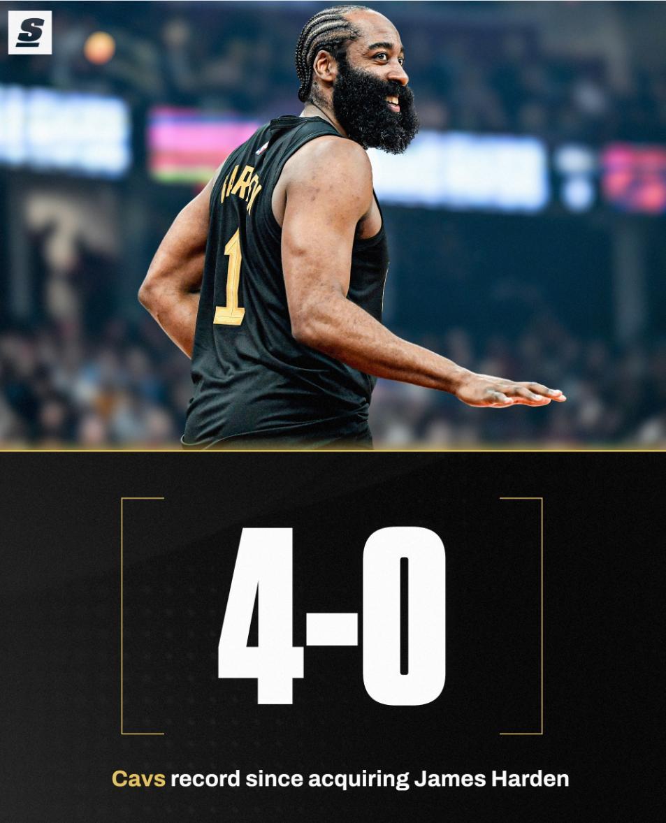 哈登被交易到騎士後的四場比賽:23+8、22+7、13+11、16+9,他是同期助攻數最多的那個,他在騎士打控球后衛時騎士的進攻非常流暢。