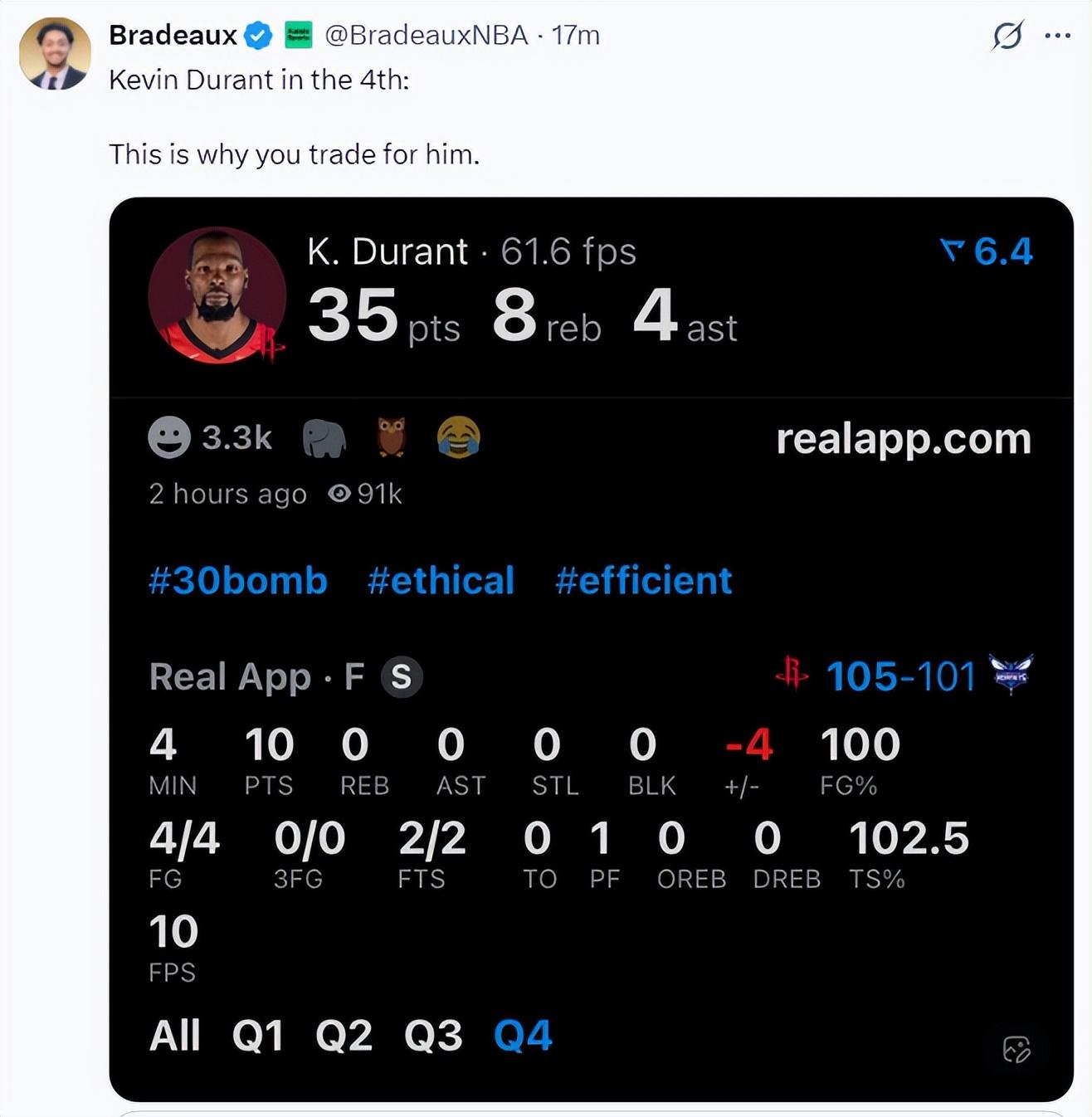 杜蘭特的第四節4分鐘,4中4,罰球2中2拿到10分,這就是我們交易他來的關鍵原因。