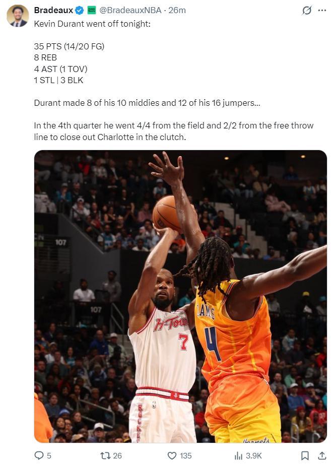 休媒:杜蘭特中投10中8,全場跳投16中12,第四節更是4中4+罰球2中2,他在關鍵時刻幫助火箭擊敗黃蜂。