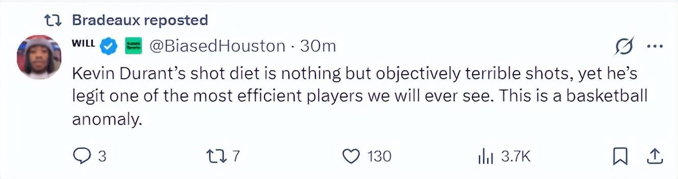 休媒:說實話我們打出了一場極其糟糕的比賽,但杜蘭特在最後一刻一人扛起火箭爲球隊挽回顏面,這就是我們交易他的原因,無論教練組多麼無能,他都能穩定輸出。