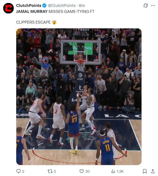美媒:穆雷錯失扳平比分的罰球,快船逃過一劫。