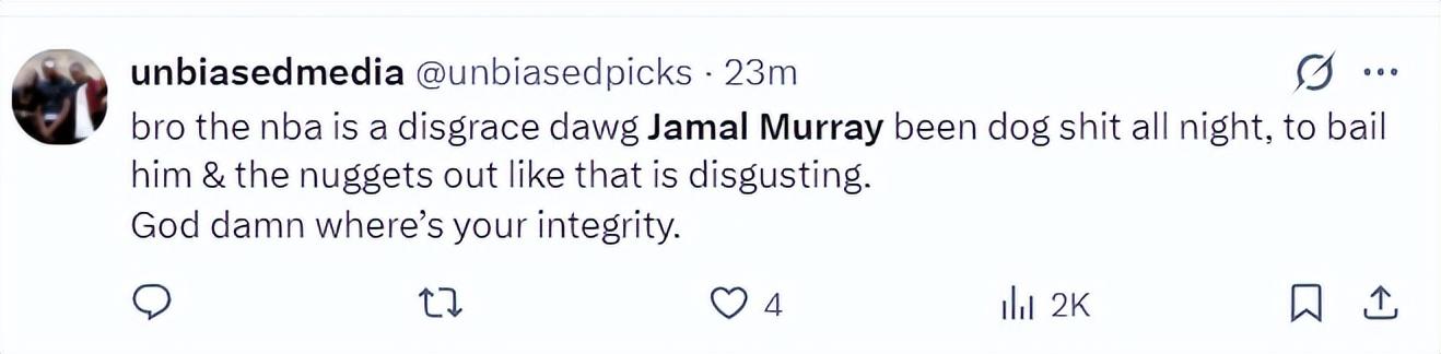 美球迷 :NBA真是令人失望,穆雷整晚都在胡作非爲,他居然幫助快船解困,簡直太令人厭惡了。NBA還有誠信可言嗎?